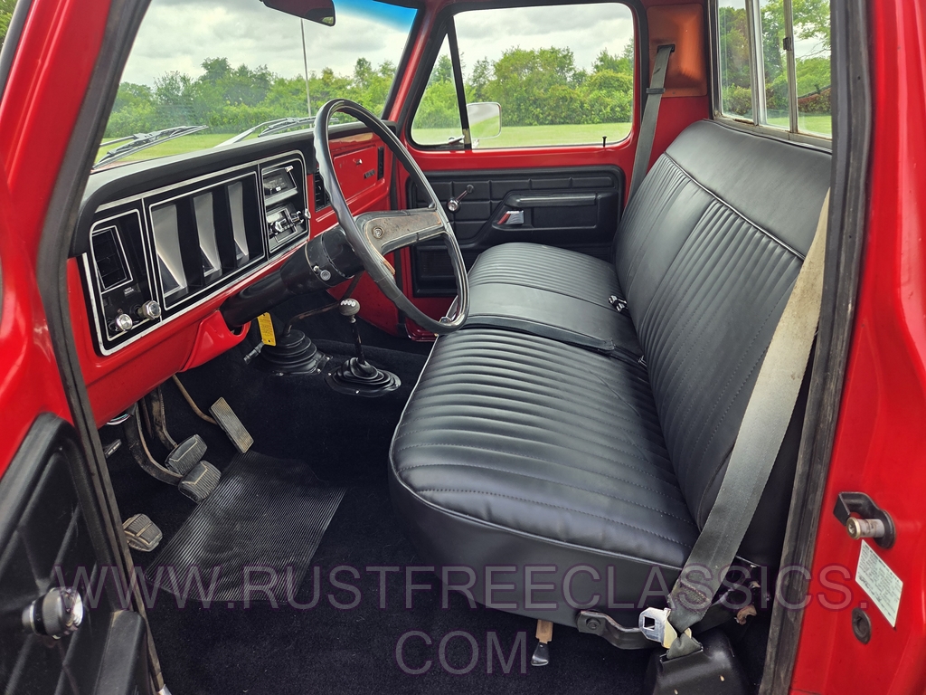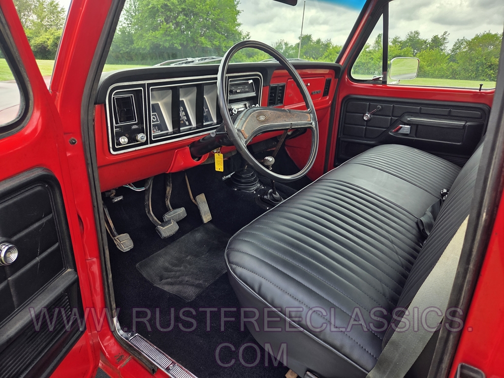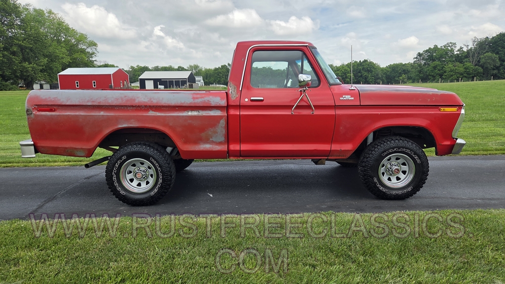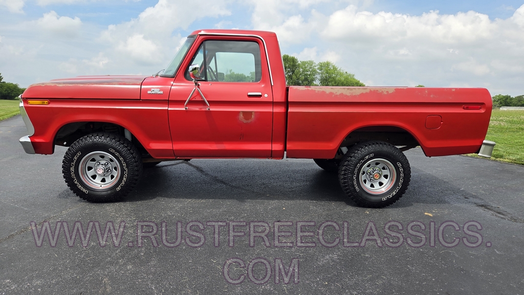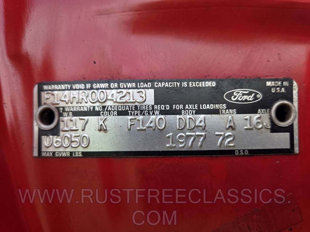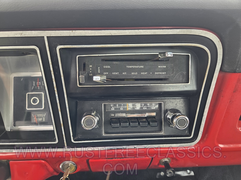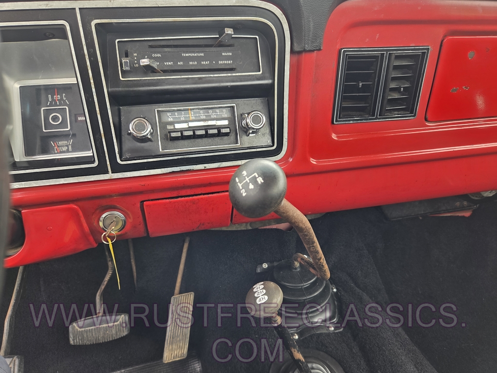 1977 F150 SWB 4×4. This is the “Custom” trim model and has just the right option: rebuilt 351, 4 speed, A/C, PS, and PDB. This truck is a nice stock original survivor that still has much of it’s original paint, and is 100% rust-free from California. It has nice Ford steel rally wheels with nice 31×10.5×15 Goodyear A/T tires. It also has conservative 3.50 gears, that make it drivable. It has nice sounding factory exhaust on it. It has a working factory AM/FM. The bed is straight inside , but does have surface rust, but no holes.